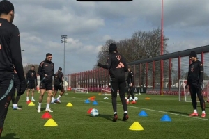 奧利塞和薩內(nèi)等球員進行快速傳球練習(xí),內(nèi)容是將球傳過不同顏色的錐形標(biāo)志,當(dāng)指令用英語發(fā)出時,奧利塞做得很好,但聽到“rot”(德語紅色)的指令,他有些不知所措。