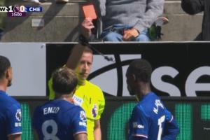 體育資訊05月11日訊 英超第36輪,紐卡vs切爾西。比賽第33分鐘,杰克遜肘擊博特曼,VAR介入后主裁判改判,將黃牌改為直紅!切爾西客場0-1落后的情況下還要少打一人,難了!