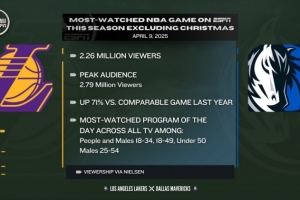 據(jù)統(tǒng)計,本場比賽平均觀看人數(shù)為226萬,創(chuàng)下ESPN本賽季除圣誕大戰(zhàn)外收視率紀(jì)錄!