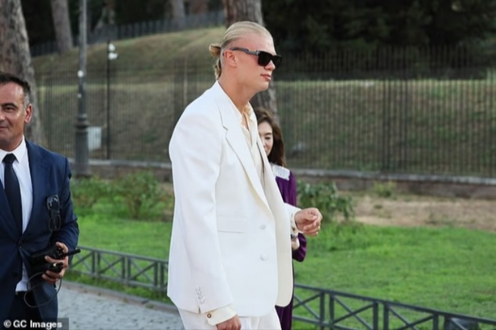 哈蘭德與女友一同抵達(dá)羅馬古羅馬廣場舉行的時裝走秀。哈蘭德身穿剪裁合身的白色兩件套西裝,里面是清爽的白襯衫。他還穿著一雙棕色絨面革休閑鞋,戴著黑色太陽鏡。