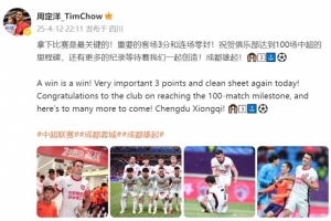 周定洋在個人微博中寫道:拿下比賽是最關(guān)鍵的!重要的客場3分和連場零封!祝賀俱樂部達(dá)到100場中超的里程碑,還有更多的紀(jì)錄等待著我們一起創(chuàng)造!成都雄起!